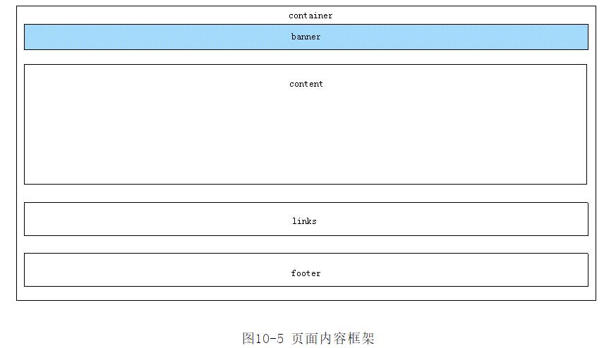 由圖10-6可以看出,在頁面外部有一個整體的框架container,banner位于頁面整體框架的最上方,content與links位于頁面的中部,其中content占據(jù)著頁面的絕大部分。最下面是頁面的腳注footer。好了,網(wǎng)站制作公司本文關(guān)于“網(wǎng)站制作如何將頁面用Div分塊?”的實(shí)操方法就分享到這里,謝謝關(guān)注,博納網(wǎng)絡(luò)編輯整理。