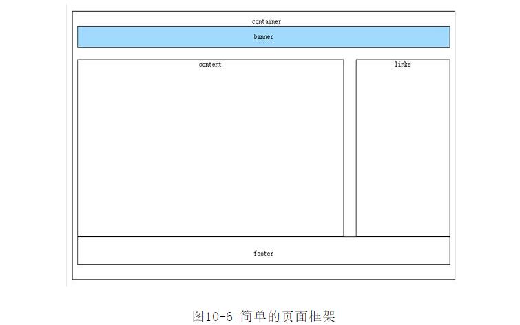 網(wǎng)站制作如何將頁面用Div分塊?深圳網(wǎng)站制作公司在此提示在利用CSS布局頁面時,首先要有一個整體的規(guī)劃,包括整個頁面分成哪些模塊,各個模塊之間的父子關(guān)系等。以最簡單的框架為例,頁面由banner、主體內(nèi)容(content)、菜單導(dǎo)航(links)和腳注(footer)幾個部分組成,各個部分分別用自己的id來標(biāo)識,如圖10-5所示。