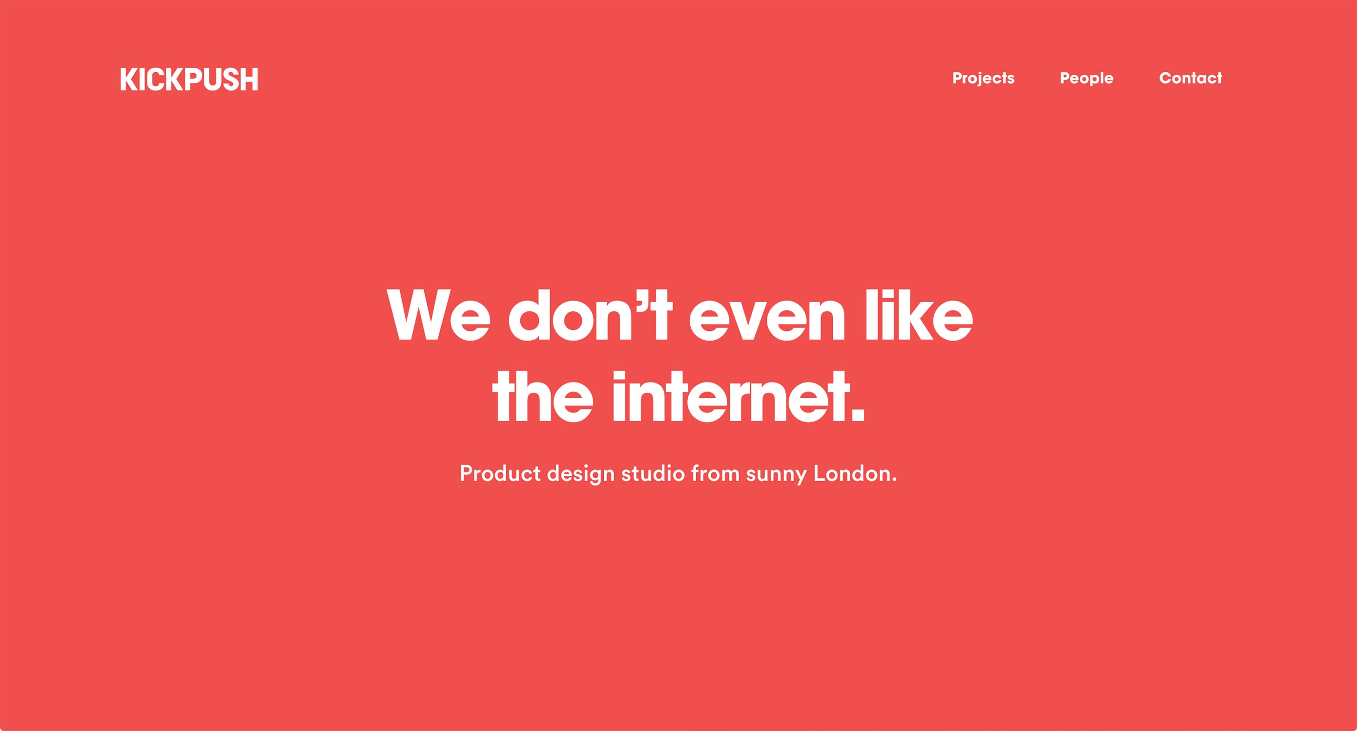 鮮艷的紅色,扁平化的網(wǎng)站設(shè)計,微妙的動效,都可以看出這個名為Kickpush 的開發(fā)團隊在設(shè)計和開發(fā)上的豐富經(jīng)驗,而他們這個作品集網(wǎng)站最突出的還是他們反諷的幽默感:“我們不喜歡互聯(lián)網(wǎng)。我們來自陽光明媚的倫敦。”