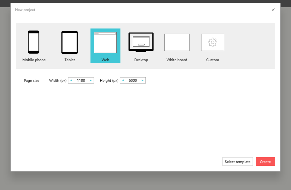 第二步:打開Mockplus,選擇網(wǎng)頁(yè)項(xiàng)目類型,設(shè)置網(wǎng)頁(yè)寬高。網(wǎng)頁(yè)最大高度為 6000 像素。