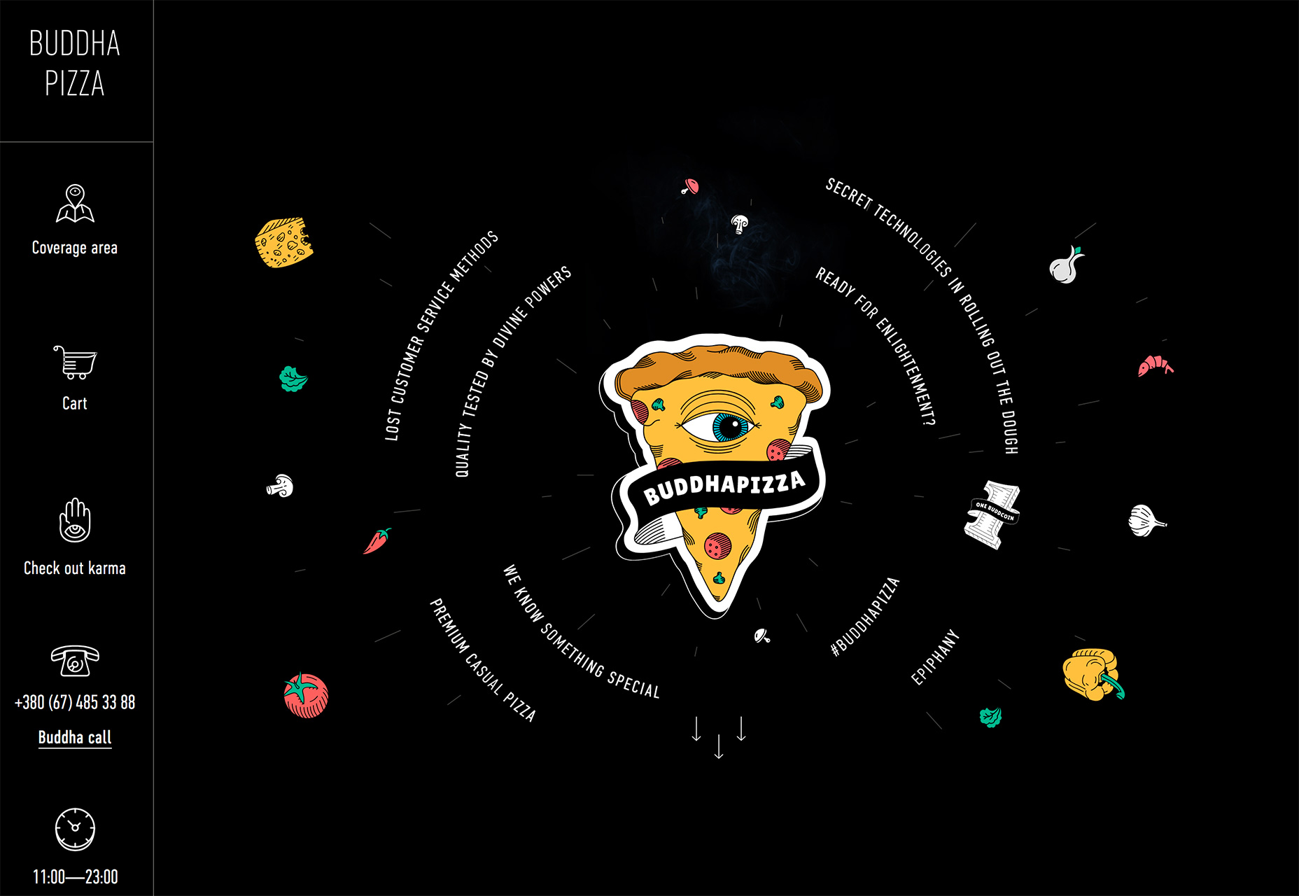 Buddha Pizza 這個頁面則讓文字構(gòu)成圓環(huán),圍繞這批薩,創(chuàng)造出獨特的視覺奇觀。