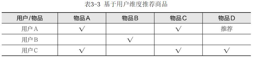從表3-3中可以看到,用戶A購買時,通過查詢比對,發(fā)現(xiàn)用戶A和用戶C是相似群體,因此根據(jù)用戶C的特征推薦商品D給用戶A。