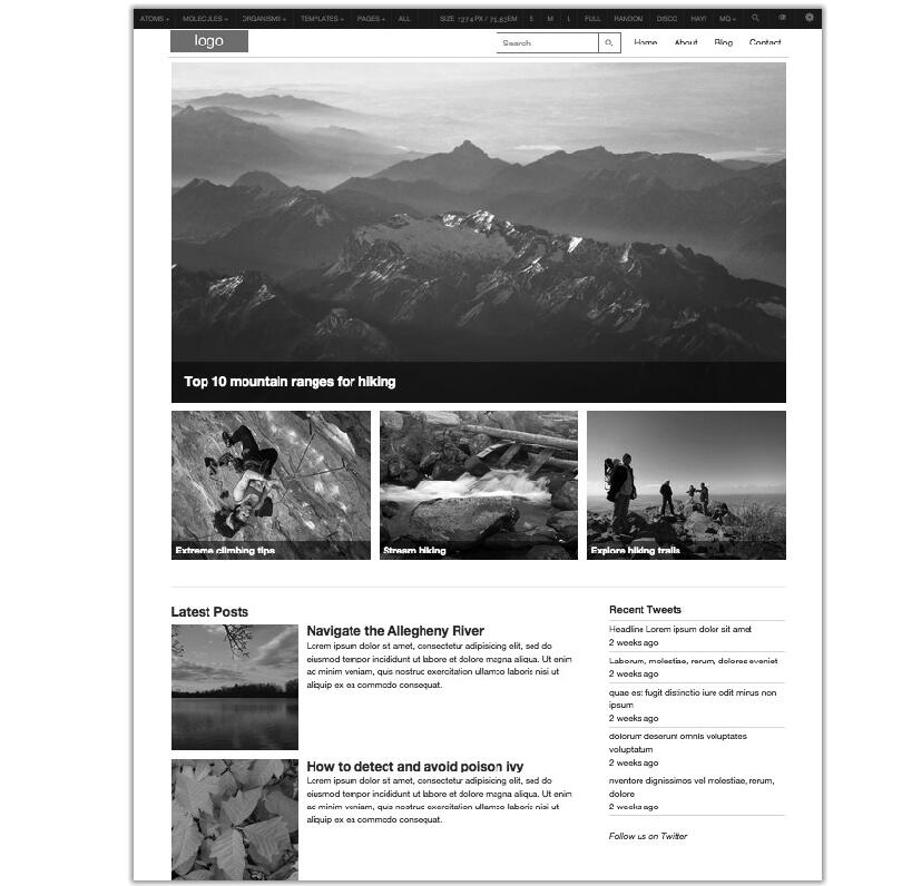 理解系統(tǒng)背后的運行原理的最好方式,就是從一個完善的界面開始,逆向推出系統(tǒng)的模板,還有 Pattern Lab 用到的數(shù)據(jù)文件。因此,下面就從廣告圖(那座山)開始,看看如何才能在頁面上展示這種帶標題的圖片。首先要明白,所有的文件按不同層級,分別放在 5 個不同的文件夾中:原子、分子、有機體、模板、頁面。每個模式都有一個文件,描述組成按鈕、輪播圖片或底部導(dǎo)航欄的標記。在頁面這一層級上,只需選擇模板并添加內(nèi)容就可以生成頁面,上面的模式也會有關(guān)聯(lián)文件,讓我們可以把 lorem ipsum 字符(或“亂數(shù)假文”)替換成真正的內(nèi)容。接下來看主頁模式的范例,在一番研究之后,我們會發(fā)現(xiàn)雪山廣告圖有這樣一個圖片標簽: