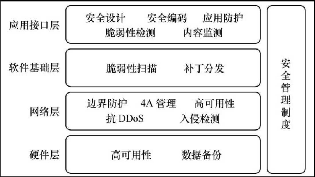 ②4A管理。4A是指Authentication、Account、Authorization、Audit,即將身份認(rèn)證、賬號、授權(quán)和審計(即不可否認(rèn)性及數(shù)據(jù)完整性)定義為網(wǎng)絡(luò)安全的四大組成部分,從而確立了身份認(rèn)證在整個網(wǎng)絡(luò)安全系統(tǒng)中的地位與作用。業(yè)務(wù)平臺對內(nèi)對外的各項訪問功能均應(yīng)納入歸屬運維部門的4A平臺進(jìn)行統(tǒng)一賬號、認(rèn)證、授權(quán)和審計管理。