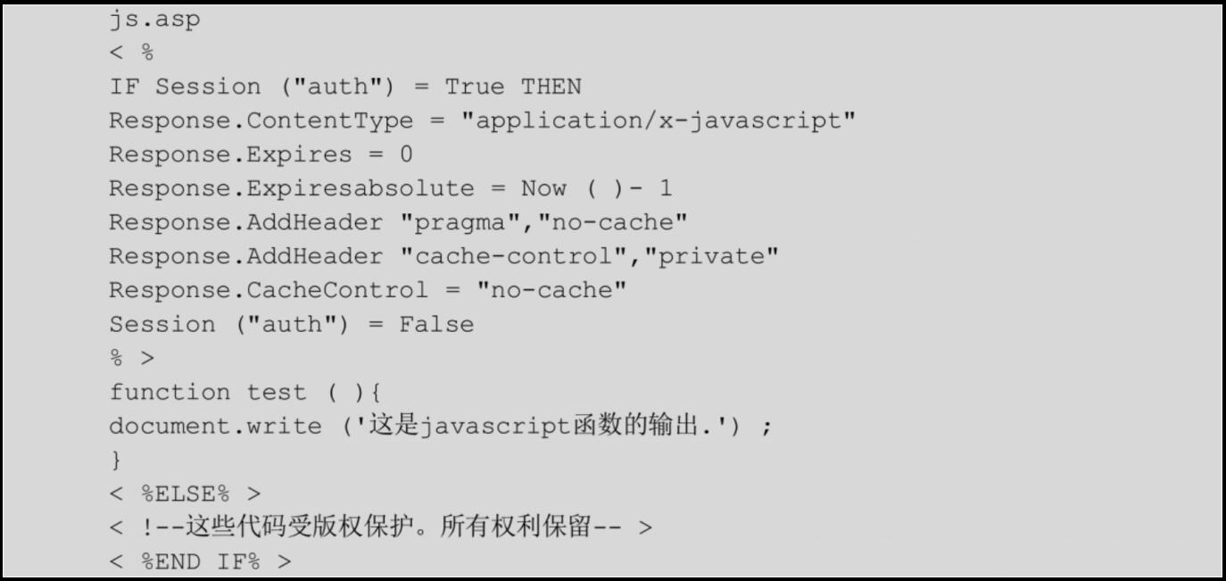 這個案例涉及三個文件:index.asp,js.asp以及global.asa。global.asa定義了一個auth會話變量,該變量用于驗證請求JavaScript源文件的頁面起源是否合法。這里選擇使用會話變量的原因在于它使用起來比較方便。