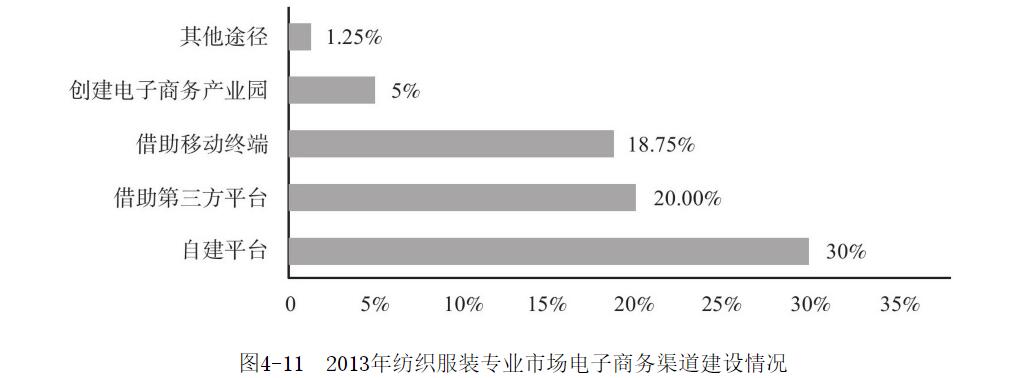 圖4-10 截至2016年1月中國網(wǎng)站數(shù)量(不包含.edu.cn下網(wǎng)站)資料來源:中國互聯(lián)網(wǎng)信息中心(CNNIC)2016年1月發(fā)布的《第37次中國互聯(lián)網(wǎng)絡(luò)發(fā)展?fàn)顩r統(tǒng)計報告》就在全球網(wǎng)站數(shù)量激增,國內(nèi)外各行業(yè)組織都在“互聯(lián)網(wǎng)+”的浪潮中擁抱互聯(lián)網(wǎng),紛紛建立自己的網(wǎng)站作為網(wǎng)上宣傳、銷售和企業(yè)擴張陣地的時候,國內(nèi)服裝企業(yè)網(wǎng)站的建設(shè)情況仍然不容樂觀。據(jù)中國紡織工業(yè)聯(lián)合會信息統(tǒng)計部、中國紡織工業(yè)聯(lián)合會流通分會編寫的《2013-2014年中國紡織服裝電子商務(wù)發(fā)展報告》統(tǒng)計,2013年,紡織服裝專業(yè)市場電子商務(wù)交易額占紡織服裝專業(yè)市場實體交易額的23.68%,紡織服裝專業(yè)市場通過自建電子商務(wù)平臺的比例為30%,借力第三方開放平臺(如天貓商城)開展電子商務(wù)的比例為20%,具體情況參考圖4-11所示。