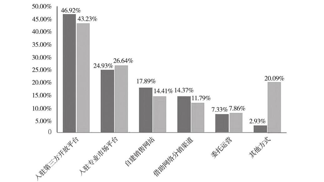 圖4-11 2013年紡織服裝專業(yè)市場電子商務(wù)渠道建設(shè)情況同時,報告還指出,在對商戶電子商務(wù)應(yīng)用情況的調(diào)查中發(fā)現(xiàn),在商戶應(yīng)用電子商務(wù)的途徑中,第三方開放平臺仍然是商戶首選,占比約43.23%;商戶選擇自建銷售網(wǎng)站平臺的比例僅為14.41%,具體情況參考圖4-12所示。