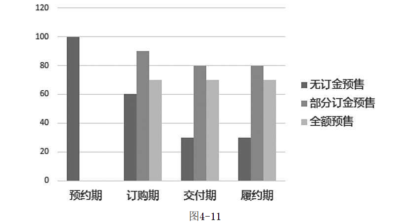 我們通過圖4-11看一下3種模式的變化情況。無訂金的模式初始人較多,但由于違約成本低,整體成單會(huì)下降較多。而訂單最穩(wěn)定的是全額預(yù)售,由于先付款,違約成本高,因此基本不會(huì)發(fā)生變化。部分訂金預(yù)售的變化介于兩者之間。
