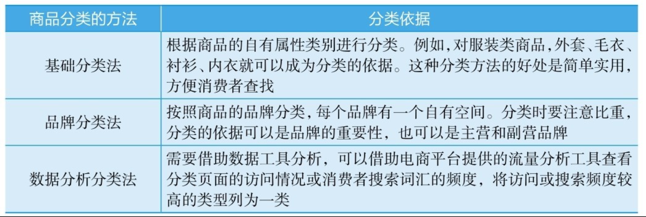 剛開張的移動端店鋪可能商品不多,商品分類方面的問題并不明顯。但隨著店鋪規(guī)模的日益擴(kuò)大和商品門類的增加,問題就會隨之而來。面對紛繁蕪雜的商品,該如何做好商品分類,才能方便消費(fèi)者進(jìn)行瀏覽和選購呢?通常情況下,商品分類的方法有三種,分別是基礎(chǔ)分類法、品牌分類法與數(shù)據(jù)分析分類法,具體如表5-1所示。