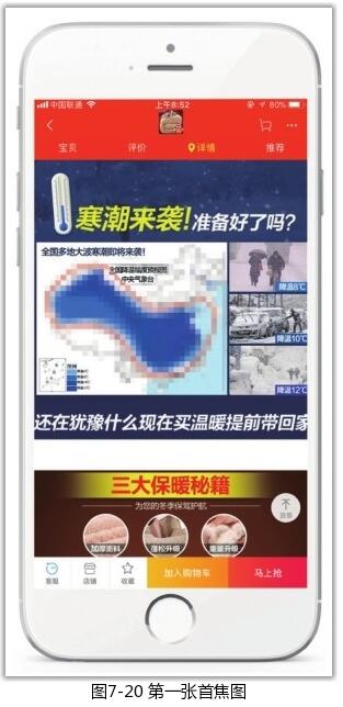 第一張首焦圖以全國降溫幅度圖和下雪的圖片相結(jié)合,以此來突出冬天的寒冷。標(biāo)題著重體現(xiàn)“寒潮來襲”這一點(diǎn),如圖7-20所示。因?yàn)檫@個(gè)時(shí)候消費(fèi)者購買冬被肯定都是為了更加暖和,保暖是商品的核心賣點(diǎn)。