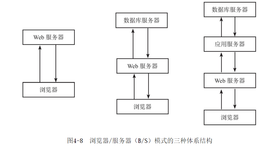 隨著20世紀90年代Internet的快速發(fā)展,一種基于Web的體系結(jié)構(gòu)逐漸發(fā)展起來,即B/S體系結(jié)構(gòu),它是以C/S體系結(jié)構(gòu)為基礎(chǔ)的,主要經(jīng)歷了如圖4-8所示的幾個發(fā)展階段。在B/S體系結(jié)構(gòu)中,客戶端利用瀏覽器通過Web服務(wù)器去訪問數(shù)據(jù)庫以獲取必需的信息,而Web服務(wù)器與特定的數(shù)據(jù)庫系統(tǒng)的連接可以通過如中間件等軟件以及應(yīng)用服務(wù)器實現(xiàn)。瀏覽器/服務(wù)器(B/S)模式的三種體系結(jié)構(gòu)。