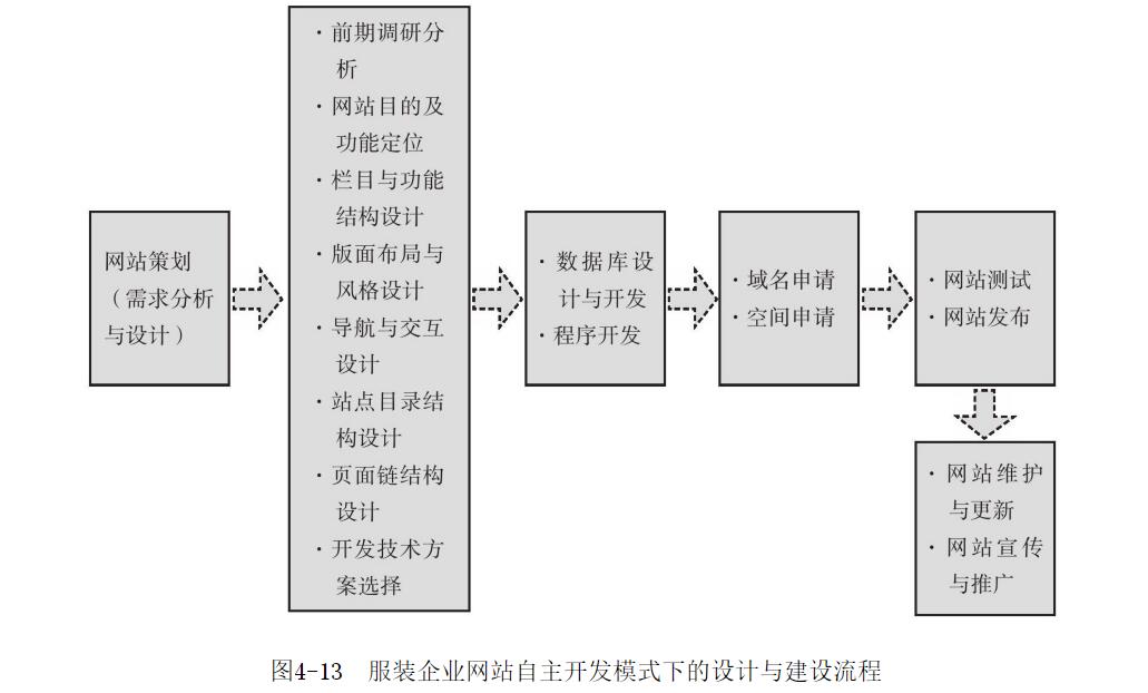 網(wǎng)站作為服裝企業(yè)開展電子商務的平臺,在企業(yè)占有舉足輕重的地位。電子商務網(wǎng)站的開發(fā)也絕不是用幾個靜態(tài)頁面就能實現(xiàn),它是一項復雜的軟件工程。所以,我們也可以利用結構化系統(tǒng)開發(fā)方法,把服裝企業(yè)電子商務網(wǎng)站的開發(fā)嚴格按照軟件工程的思路分為系統(tǒng)規(guī)劃、系統(tǒng)分析、系統(tǒng)設計、系統(tǒng)實施、系統(tǒng)運行與維護等幾個階段。下面,我們按照軟件工程結構化系統(tǒng)開發(fā)方法,同時結合圖4-13的流程分析,對服裝企業(yè)在自主開發(fā)模式下,網(wǎng)站的設計與建設流程進行逐項分析。