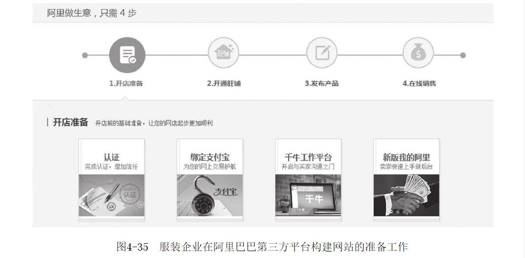 圖4-34 阿里巴巴官方網(wǎng)站首頁服裝企業(yè)在阿里巴巴第三方平臺構(gòu)建網(wǎng)站的開店準備工作還包括企業(yè)名稱認證、綁定支付寶、千牛工作平臺的安裝等工作。本階段的操作過程可以參考圖4-35所示內(nèi)容,