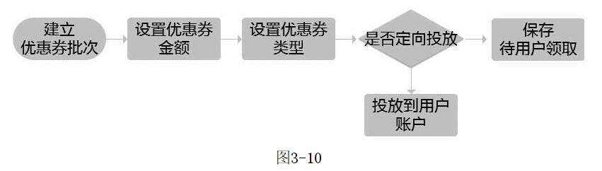 如圖3-4所示。優(yōu)惠券運營專員負責配置優(yōu)惠券的基本信息(金額、門檻和投放區(qū)域等),這里優(yōu)惠券包括紅包、優(yōu)惠券和充值卡等。完成配置后,根據(jù)運營的規(guī)劃投放給指定類型或者指定區(qū)域的人群,