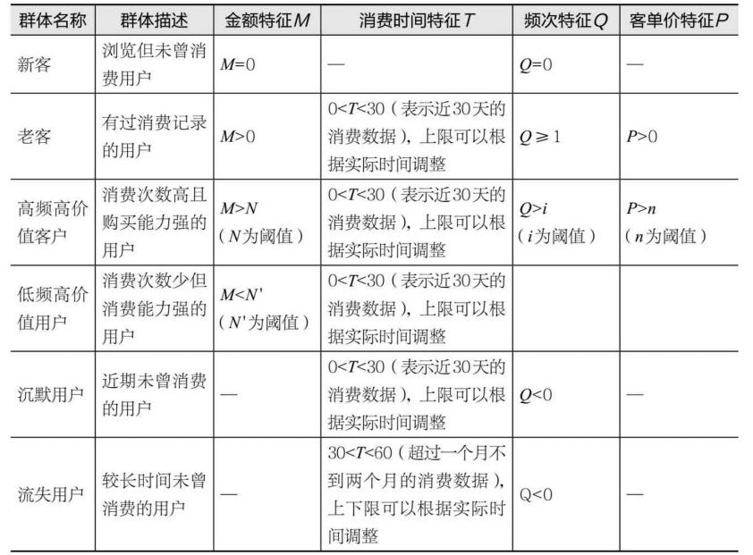 電商小程序類制作關(guān)于用戶生命周期用戶模塊主要是對(duì)用戶的數(shù)據(jù)進(jìn)行歸類管理并完成用戶群體的定義。群體的定義多是由不同特征組合篩選獲得的,定義好的用戶群體用來進(jìn)行數(shù)據(jù)分析和定向投放使用。用戶群體的劃分可以由系統(tǒng)根據(jù)既定規(guī)則進(jìn)行處理,也可以人為通過CRM后臺(tái)進(jìn)行配置、打簽。通常用戶群體的劃分遵從于營銷指標(biāo)的定義,我們將指標(biāo)拆解開來,可以看到指標(biāo)主要圍繞4個(gè)維度:金額、時(shí)間、頻次和客單價(jià)。當(dāng)然,CRM還會(huì)從其他的一些維度來補(bǔ)充豐富用戶特征,比如年齡、地域、職業(yè)性別、是否收藏、是否加購物車和是否進(jìn)店等。按照這個(gè)標(biāo)準(zhǔn),我們以電商類營銷中較常見的幾個(gè)用戶群體為例,看一下4個(gè)主要特征拆解后的情況,見表5-1。