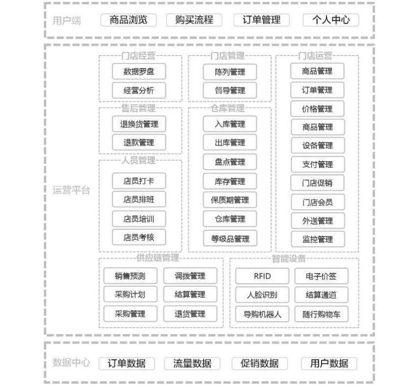 如圖7-6所示。倉庫環(huán)節(jié)需要搭建倉庫的庫區(qū)庫位管理,雖然無法像大倉一樣復雜,但基本的入庫、出庫、揀貨和盤點等是需要具備的。需要對庫存進行監(jiān)控預警管理,確保庫存的可售。前店商品的陳列也需要進一步對客流購買的情況進行數據沉淀,確定店鋪內的熱力區(qū),即銷售情況,適時調整陳列,提高商品收益。銷售方面,店鋪內的流量受地域、選址等因素限制,往往會穩(wěn)定在一定的區(qū)間內,我們需要將店鋪內的坪效進一步擴大。這時候引入新的銷售渠道就是不錯的方法,線上流量的導入可以有效地提升人員的坪效和收益。為此需要提供線上的一套平臺服務和系統(tǒng),它們包括電商的一些基本功能模塊,如訂單、促銷、會員、優(yōu)惠券和用戶端等。履約方面,由于便利店的服務范圍有限,因此服務區(qū)域也同O2O小程序類似,配送履約的方式按照用戶的簽收方式分為到店和到家兩種模式。到家模式可以按照O2O小程序的方式進行履約生產,線上下單支付后,店內進行接單并針對商品進行分揀,等待第三方配送人員到達后交貨進行履約。到店模式則簡單許多,用戶下單后可以到店支付并完成自提的過程,這樣進一步為店內消費場景增加了流量和購買機會。