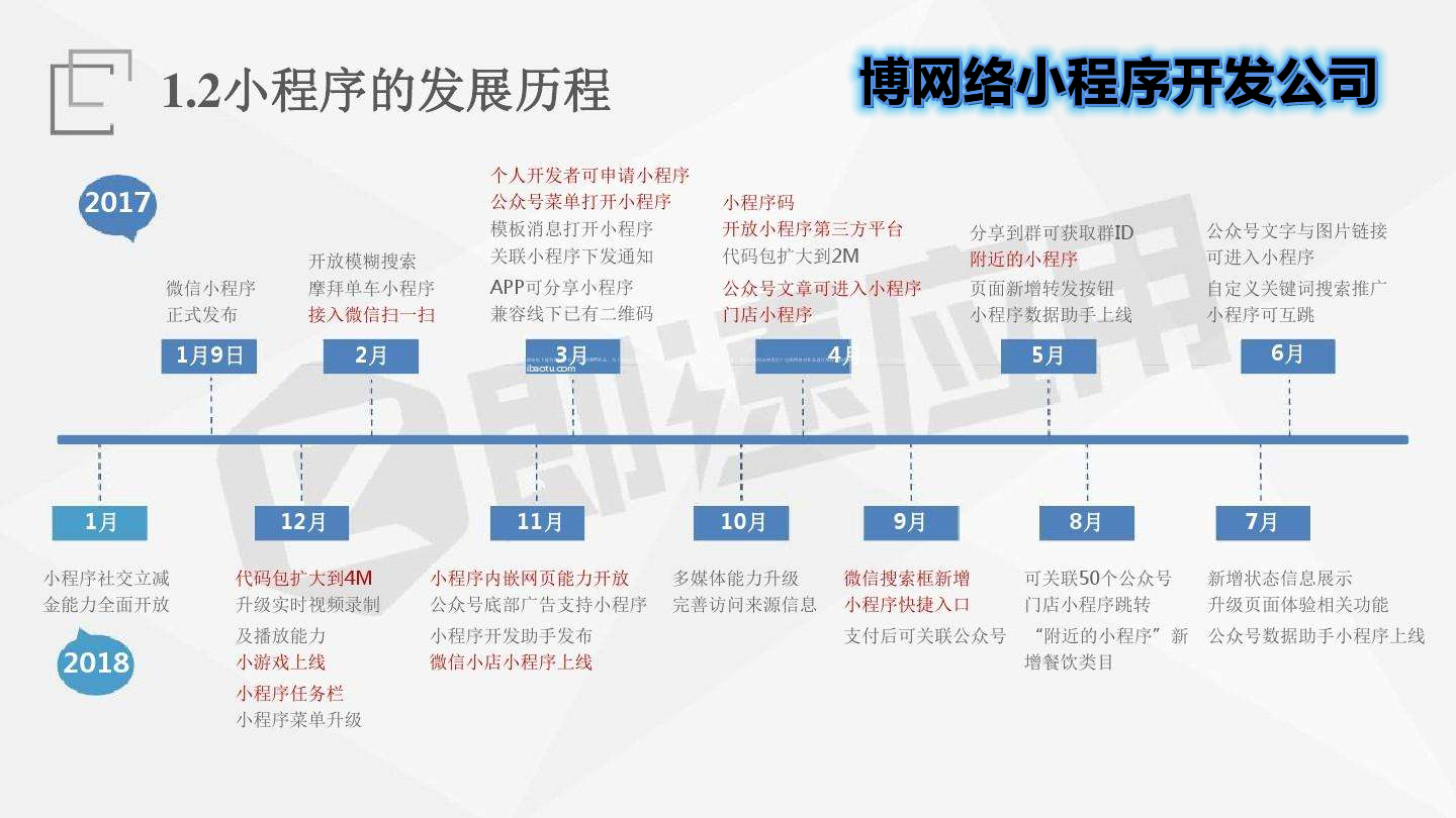 2015年1月9日,微信開放微信內網頁開發(fā)工具包(微信JS-SDK)。JS-SDK增強了H5的功能,為微信用戶提供更優(yōu)質的網頁體驗。2015年2月12日,公眾平臺全面開放自定義菜單。7.2016年2016年9月22日,微信宣布“應用號”開始內測,定名為“微信小程序”。2016年11月3日,微信團隊宣布微信小程序正式開放公測。2016年11月19日,張小龍在朋友圈發(fā)布小程序最新進展,從公布的圖片來看,微信小程序具備桌面圖標方式的入口。好了,深圳小程序開發(fā)公司本文關于“小程序開發(fā)關于微信小程序發(fā)展歷程詳解”知識就分享到這里,謝謝關注,博納網絡編輯整理。