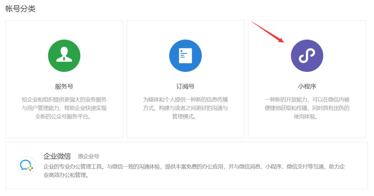 小程序開發(fā)公司提醒微信自誕生以來,一直以開放的方式發(fā)展,它提供了微信公眾平臺(tái),可以讓企業(yè)、媒體、開發(fā)者加入到平臺(tái)中,為微信用戶提供資訊和服務(wù)。在微信公眾平臺(tái)中,提供了4種類型的賬號(hào),分別是服務(wù)號(hào)、訂閱號(hào)、小程序和企業(yè)微信(原企業(yè)號(hào))。打開微信公眾平臺(tái)網(wǎng)站https://mp.weixin.qq.com,可以查看這4種賬號(hào)的說明,如圖1-4所示。