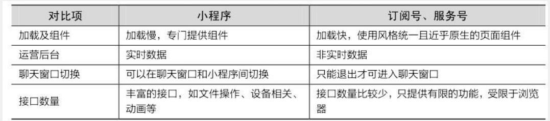 表1-2小程序與訂閱號(hào)、服務(wù)號(hào)的區(qū)別