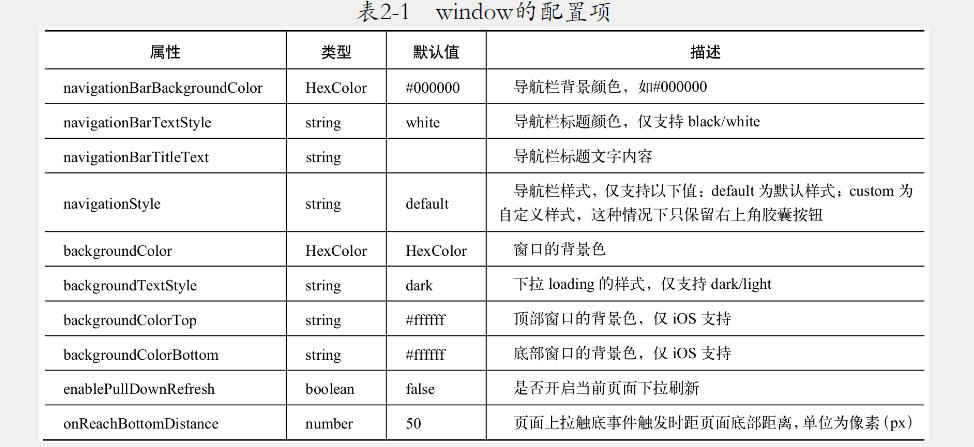 window是窗口的樣式設置,用來設置微信小程序的狀態(tài)欄、標題、導航欄等的樣式。顏色只接受十六進制的顏色值。其屬性如表2-1所示,