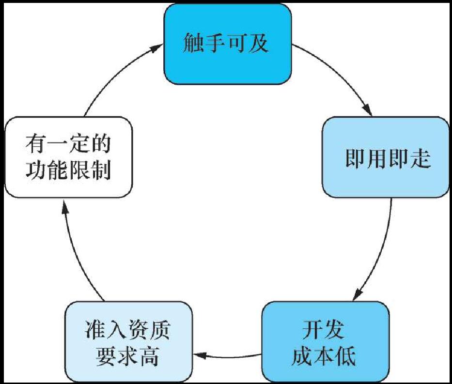 小程序開發(fā)公司認(rèn)為小程序時代的來臨重新定義微信的未來,微信小程序等于新一輪商業(yè)紅利,小程序是一種無須下載、安裝,只需掃描二維碼或搜索就能打開、使用的應(yīng)用,真正做到了觸手可及、即用即走,并且不會占用用戶的手機(jī)內(nèi)存,免除了用戶因應(yīng)用太多而拖慢手機(jī)運(yùn)行速度的困擾。由此可見,小程序開發(fā)公司統(tǒng)計出小程序具有以下五大特點,如圖1-1所示。