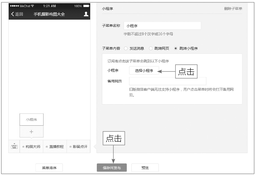 公眾號菜單欄可跳轉(zhuǎn)小程序功能,相當(dāng)于增加了從公眾號進(jìn)入小程序的一條途徑。運營者只需進(jìn)行如下操作便可實現(xiàn)公眾號菜單欄跳轉(zhuǎn)至小程序。步驟1進(jìn)入微信公眾號后臺,在“自定義菜單”界面點擊圖標(biāo),操作完成后,頁面中將出現(xiàn)子菜單欄的相關(guān)設(shè)置,如圖4-2所示。