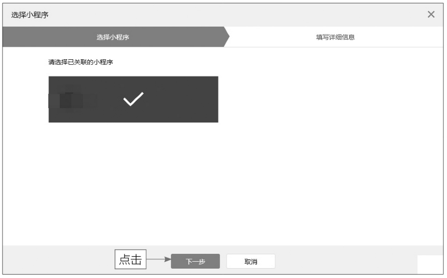操作后,頁面將轉(zhuǎn)至“選擇小程序”界面。運營者需要在該界面中選擇已關(guān)聯(lián)的小程序,并點擊下方的“下一步”按鈕,如圖4-5所示。