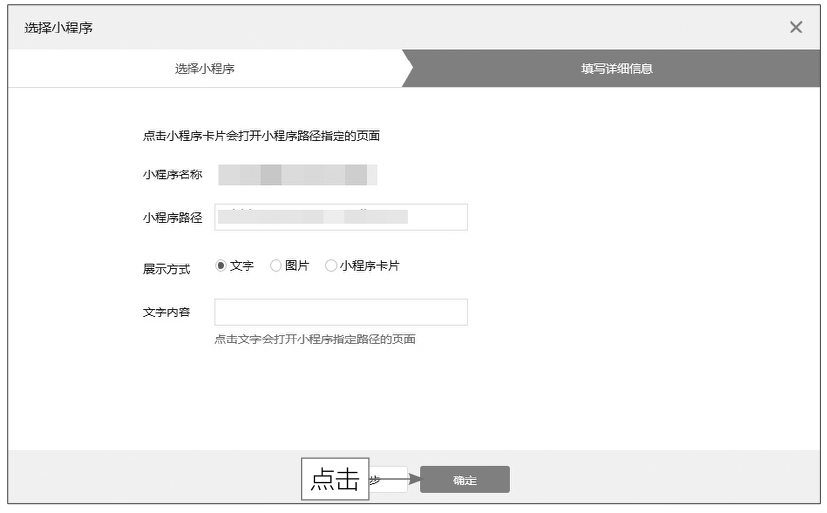 圖4-5 “選擇小程序”界面步驟3完成操作后,頁面將轉(zhuǎn)至“填寫詳細(xì)信息”界面。在該界面選擇展示方式、填寫文字內(nèi)容,并點擊下方的“確定”按鈕,如圖4-6所示。