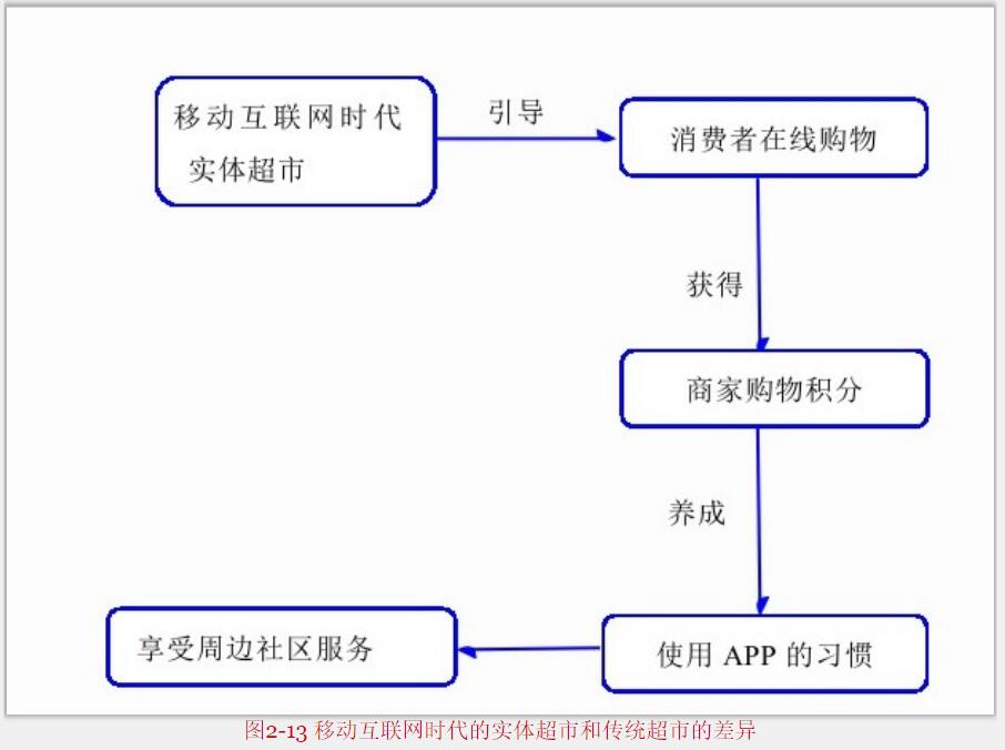 建立了超市后,需要讓顧客下載安裝使用小程序,但如果顧客都使用小程序在門店購物,那么超市利潤就不會(huì)很高。移動(dòng)互聯(lián)網(wǎng)時(shí)代的實(shí)體超市和傳統(tǒng)超市不同,如圖2-13所示。