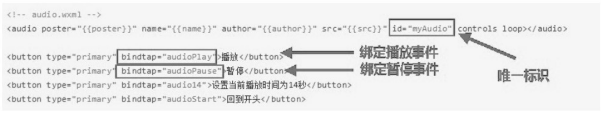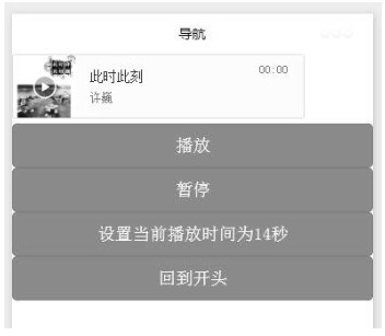 //audio.jsPage({onReady:function(e){//使用wx.createAudioContext獲取audio上下文contextthis.audioCtx=wx.createAudioContext('myAudio')},data:{poster:'http://y.gtimg.cn/music/photo_new/T002R300x300M000003rsKF44GyaSk.jpg?max_age=2592000',name:'此時此刻',author:'許巍',src:'http://ws.stream.qqmusic.qq.com/M500001VfvsJ21xFqb.mp3?guid=ffffffff82def4af4b12b3cd9337d5e7&uin=346897220&vkey=6292F51E1E384E06DCBDC9AB7C49FD713D632D313AC4858BACB8DDD29067D3C601481D36E62053BF8DFEAF74C0A5CCFADD6471160CAF3E6A&fromtag=46',},audioPlay:function(){this.audioCtx.play()},audioPause:function(){this.audioCtx.pause()},audio14:function(){this.audioCtx.seek(14)},audioStart:function(){this.audioCtx.seek(0)}})