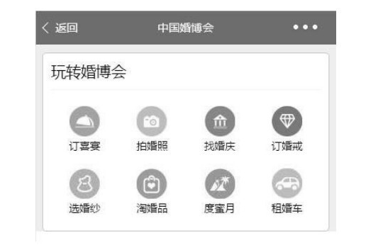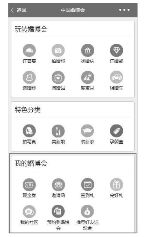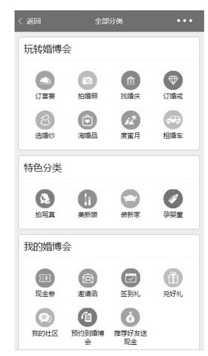 深圳小程序制作公司提醒全部分類導(dǎo)航界面集合了中國(guó)婚博會(huì)所有的導(dǎo)航入口,它可以分為3類導(dǎo)航:玩轉(zhuǎn)婚博會(huì)導(dǎo)航,有訂喜宴、拍婚照、找婚慶等服務(wù);特色分類導(dǎo)航,有拍寫真、美新娘等服務(wù);我的婚博會(huì)導(dǎo)航,有現(xiàn)金券、邀請(qǐng)函、簽到禮等服務(wù)。這3類導(dǎo)航布局方式一樣,可以先設(shè)計(jì)一類導(dǎo)航,然后直接進(jìn)行復(fù)用,如圖8.22所示。