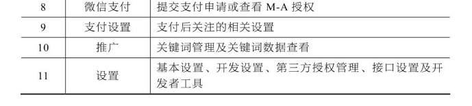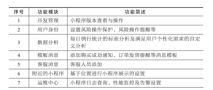 小程序后臺(tái)包括“開(kāi)發(fā)管理”“用戶身份”“數(shù)據(jù)分析”等11個(gè)功能模塊,如表3-1所示。