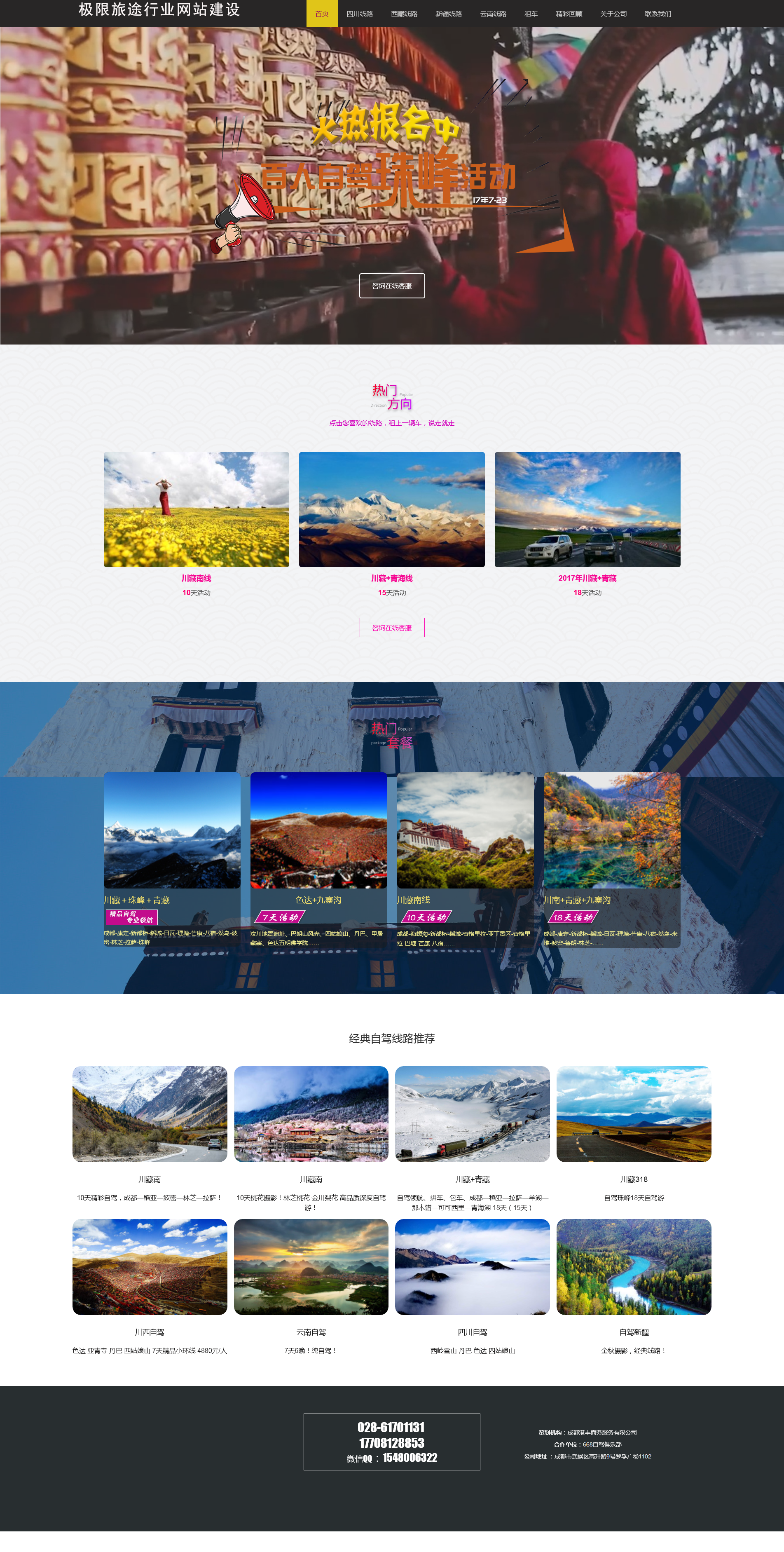 極限旅途行業(yè)網(wǎng)站建設(shè):自然的風(fēng)光和神秘的宗教以及厚重的多元的民族文化,帶給你的是精神上的饕餮盛宴和觸及靈魂深處的碰撞。領(lǐng)隊寄語旅行的意義在于行,我們希望你用行走見聞記錄這純粹的大自然之美,以你的內(nèi)心去感受這個雪域民族留在這廣袤大地上的寺廟、經(jīng)幡、白塔、瑪尼堆。以及陪伴他們世世代代的雪山、森林、冰川、湖泊、草原!只做大自然之美的見證者和記錄者。我們只想呈現(xiàn)給你非常美十分值得的,而不是方便,簡單的。賺錢與質(zhì)量之間,我們選擇后者。 攝影自駕旅行、戶外遠(yuǎn)足、徒步穿越是我們的工作也是我們的愛好。