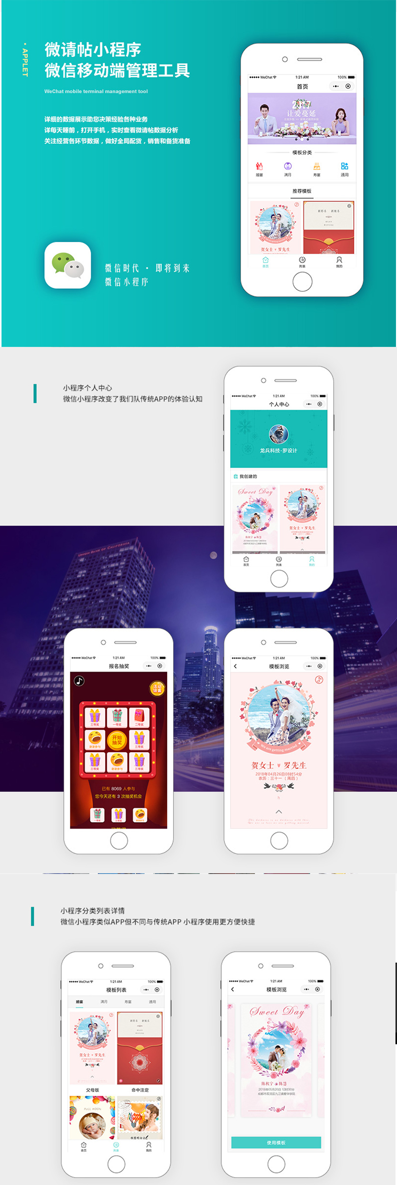 《微請(qǐng)?zhí)肥且豢顐€(gè)人自助創(chuàng)建各類請(qǐng)?zhí)男〕绦?,在微?qǐng)?zhí)〕绦颍憧梢噪S時(shí)隨地就能在小程序上編輯各類“微請(qǐng)?zhí)?。服?wù)各類型宴席請(qǐng)?zhí)?,無論結(jié)婚、滿月酒、祝壽、朋友聚會(huì)、還是考取大學(xué)、公司活動(dòng)、企業(yè)招聘、各種請(qǐng)?zhí)伎梢赃x擇自己合適的風(fēng)格來編輯自己想要的請(qǐng)?zhí)?,微?qǐng)?zhí)庉嫵晒笥脩艨梢钥焖俎D(zhuǎn)發(fā)到自己的微信朋友圈和微信好友進(jìn)行分享,無需其他推廣方式就可獲取較好的流量和用戶。這樣可快速提高小程序知名度和用戶效率轉(zhuǎn)換。并且可靈活使用小程序?yàn)楦鞣N企業(yè)進(jìn)行品牌推廣、打廣告、做宣傳。