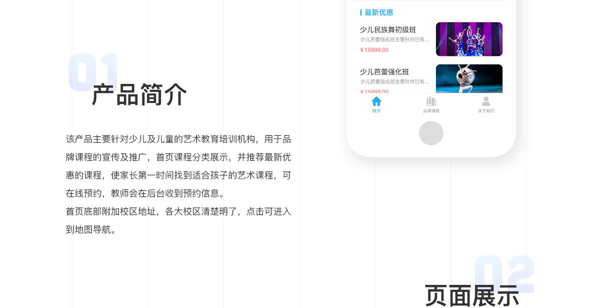該小程序主要針對少兒及兒童的藝術(shù)教育培訓機構(gòu),用于品牌的課程的宣傳及推廣,首頁課程分類展示,并推薦最新優(yōu)惠的課程,使家長第一時間找到適合孩子的藝術(shù)課程,可在線預約,教師會在后臺收到預約信息。