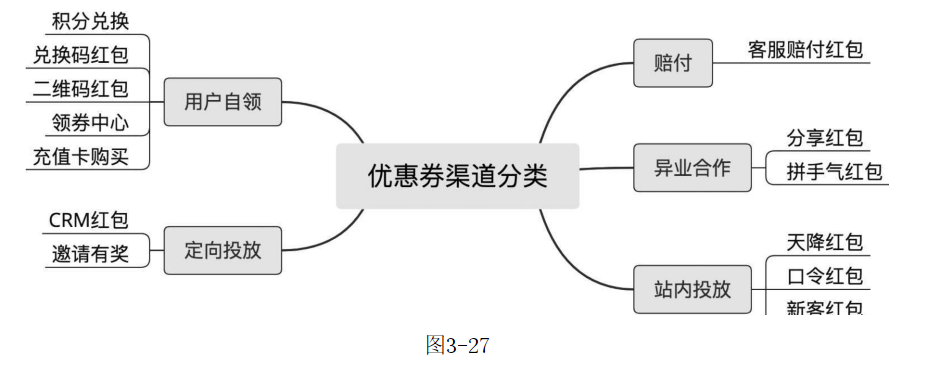 推廣策劃工程師在這里不做詳述,大家如果有興趣可以自行了解。賠付策略的原理與補(bǔ)貼策略的原理相似,不過(guò)沒(méi)有這么復(fù)雜的計(jì)算。賠付的目的是消除用戶(hù)的厭惡情緒,提高用戶(hù)體驗(yàn),但同時(shí)也要避免惡意索賠的情況,因此,賠付的原則也是在給定的區(qū)間范圍內(nèi)進(jìn)行賠付金額和數(shù)量的設(shè)定,同時(shí),當(dāng)達(dá)到某些條件時(shí)(如賠付優(yōu)惠券總數(shù)量超限、賠付總金額超限、單個(gè)優(yōu)惠券金額過(guò)大或同一訂單重復(fù)賠付等)需要進(jìn)行人工過(guò)審,確認(rèn)后方可進(jìn)行優(yōu)惠券賠付。賠付的優(yōu)惠券會(huì)直接放入對(duì)應(yīng)用戶(hù)的賬戶(hù)內(nèi),不需要單獨(dú)領(lǐng)取。渠道投放管理制訂完?duì)I銷(xiāo)方案后,我們就需要向各個(gè)渠道進(jìn)行優(yōu)惠券投放,投放渠道不同,優(yōu)惠券也有所區(qū)別。渠道主要分為5類(lèi),如圖3-27所示。