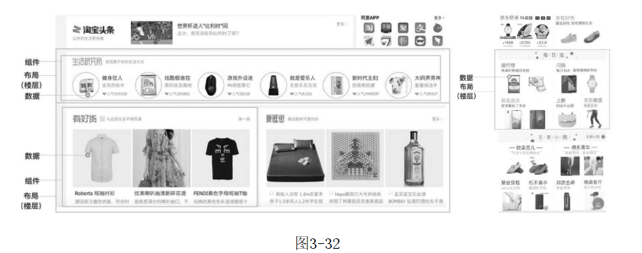圖3-32所示的每個樓層都是按照一定的排列方式進行展示的,這種排列方式我們叫作布局或者模板。一般意義上每一行都可以稱作一個樓層,整個頁面的布局就是由多個樓層組合而成的。每一個樓層內(nèi)都可以包含若干組件的組合,考慮到美觀問題,一般同一樓層的高度是一致的,使用的組件也需要高度一致。確定組件類型以后就需要將數(shù)據(jù)填充到組件中,數(shù)據(jù)也叫素材,來自不同的渠道和系統(tǒng),按照組件的要求進行合并,最終變成用戶看到的頁面內(nèi)容。