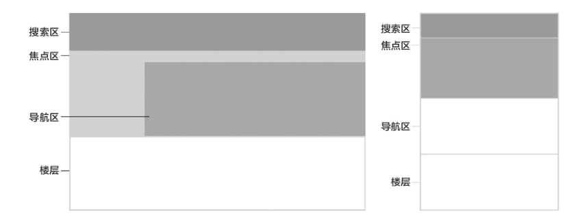 ?首頁首頁除了基礎樓層外,還包括頭部焦點區(qū)域。頭部焦點區(qū)域主要存放一些核心的內(nèi)容和導航功能,包括搜索區(qū)、導航區(qū)和焦點區(qū)等,結(jié)構(gòu)如圖3-33所示。
