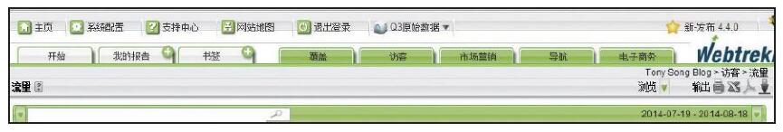 如圖2-17所示,在Webtrekk工具的導航條中,可以發(fā)現(xiàn)Q3通過不同的配色和標簽的位置設(shè)計將導航中的菜單分成了兩個部分:左邊灰色的部分是用戶自定義的內(nèi)容,如用戶自定義的報告和書簽內(nèi)容等。右邊是WebtrekkQ3的標準報告內(nèi)容,從左到右分別是數(shù)據(jù)概覽報告、訪問者報告、營銷渠道報告、內(nèi)容導航報告和電商報告。使用者可以根據(jù)每次使用工具的目的按位置和顏色快速找到相應(yīng)的報告和功能。