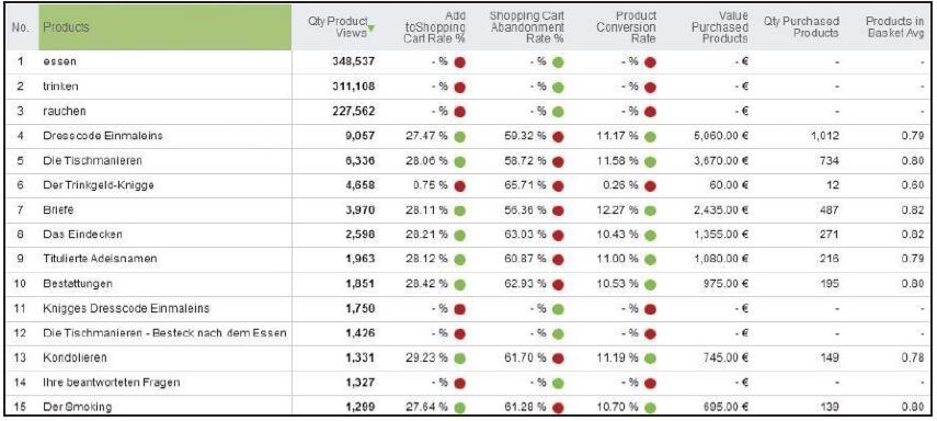 如圖2-18所示,在WebtrekkQ3的報告中,會自動對關(guān)鍵指標標注紅黃綠燈,以表示當前指標在這個時間段網(wǎng)站整體指標中的表現(xiàn)。這種指標可視化的方法可以讓分析師在打開報告后第一時間在許多數(shù)據(jù)中找到需要優(yōu)先關(guān)注的內(nèi)容。