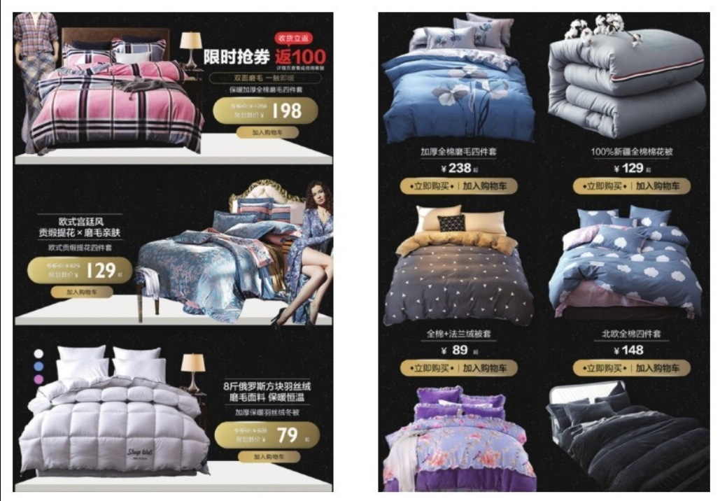 通過圖5-17不難發(fā)現(xiàn),賣家在對店鋪中的家紡四件套進行宣傳時,不論是商品圖片還是促銷圖片,都采用了俯視的拍攝角度去表現(xiàn)商品,這樣不僅能夠更為全面地展示商品,更有利于表現(xiàn)商品的特點。這樣拍攝出來的圖片能有助于展示商品的專屬宣傳元素,而專屬拍攝標準的建立也會增強商品在表現(xiàn)時的統(tǒng)一感,便于消費者記憶。